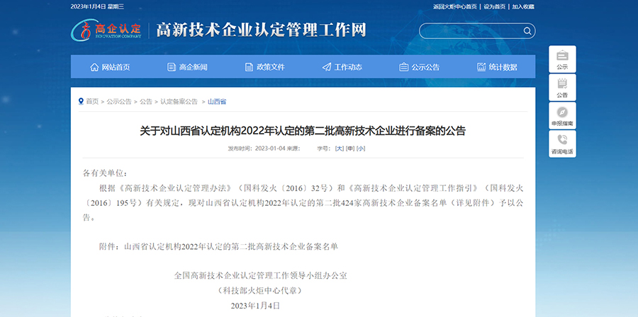 近日,根據(jù)《高新技術(shù)企業(yè)認(rèn)定管理辦法》(國科發(fā)火〔2016〕32號)和《高新技術(shù)企業(yè)認(rèn)定管理工作指引》(國科發(fā)火〔2016〕195號)有關(guān)規(guī)定,全國高新技術(shù)企業(yè)認(rèn)定管理工作領(lǐng)導(dǎo)小組辦公室對山西省認(rèn)定機(jī)構(gòu)2022年認(rèn)定的第二批高新技術(shù)企業(yè)予以公告??荡T(山西)智能制造有限公司(簡稱“山西康碩”)經(jīng)過層層篩選和嚴(yán)格審核,正式通過認(rèn)定,成為高新技術(shù)企業(yè)。獲得此次高新技術(shù)企業(yè)認(rèn)證的殊榮,是在關(guān)鍵零部件領(lǐng)域開拓創(chuàng)新的結(jié)果。