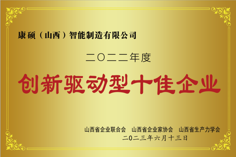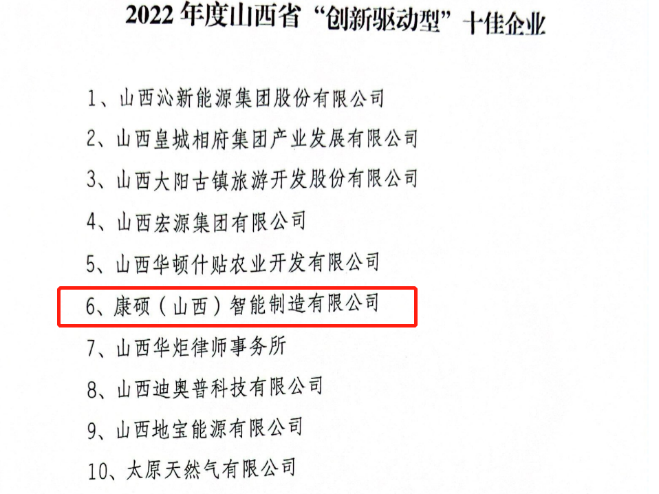 近日,根據(jù)山西企聯(lián)[2023]6號(hào)文件精神,通過(guò)山西企聯(lián)系統(tǒng)和山西省生產(chǎn)力學(xué)會(huì)的組織推薦及企業(yè)自愿申報(bào),由山西企聯(lián)、山西省生產(chǎn)力學(xué)會(huì)組織有關(guān)專家對(duì)企業(yè)申報(bào)的技術(shù)創(chuàng)新成果、管理創(chuàng)新成果、專利發(fā)明與應(yīng)用以及企業(yè)研發(fā)費(fèi)用占銷售收入的比例,科研人員占職工總數(shù)的比例等方面進(jìn)行逐項(xiàng)排序分析和綜合研判,康碩(山西)智能制造有限公司(以下簡(jiǎn)稱“山西康碩”)榮獲2022年度山西省“創(chuàng)新驅(qū)動(dòng)型”十佳企業(yè)。