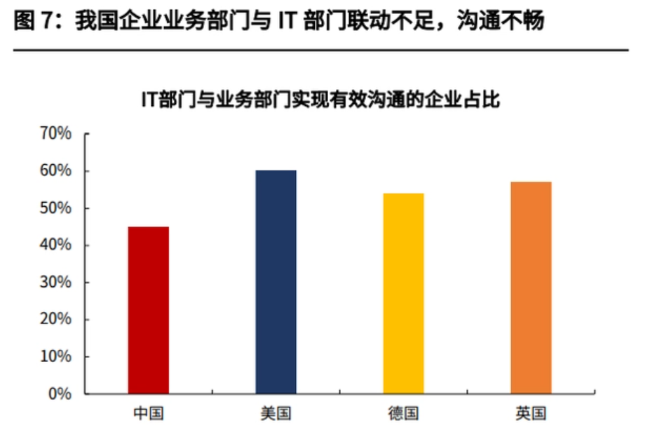 由于智能制造的推進(jìn)涉及生產(chǎn)、銷售和 IT 等多部門,部門間的信息溝通效率和通力合作程度,是充分挖掘企業(yè)實(shí)際需求,并決定企業(yè)數(shù)字化改造發(fā)力方向和 實(shí)際效果的重要因素。在這一方面,雖然各國(guó)都多少存在業(yè)務(wù)部門和 IT 部門溝通不暢的問題,但我國(guó)相較于發(fā)達(dá)國(guó)家仍有差距。這一痛點(diǎn)問題的解決不僅需要自上而下的戰(zhàn)略設(shè)計(jì)和組織變革,也需要企業(yè)內(nèi)部基礎(chǔ)設(shè)施的有力支撐。在企業(yè)內(nèi)部基礎(chǔ)設(shè)施方面,各國(guó)數(shù)字化改造的過程中,都多少受到了原有 IT 基礎(chǔ)設(shè)施水平不足的限制,而我國(guó)企業(yè)在這一方面遇到的阻礙更大。一方面,企業(yè)生產(chǎn)、采購(gòu)、財(cái)務(wù)等系統(tǒng)間數(shù)據(jù)缺乏互通互聯(lián)性,導(dǎo)致信息孤島問題的產(chǎn)生,因此各部門之間的信息溝通不暢不僅是組織架構(gòu)的欠缺,也是客觀支撐條件的不足。另一方面,企業(yè)內(nèi)部流程、資源和培訓(xùn)的缺失,也使得技術(shù)引入易而見效難, 轉(zhuǎn)型開啟易而落實(shí)難。企業(yè)在購(gòu)置信息系統(tǒng)和設(shè)備時(shí),往往缺乏對(duì)自身實(shí)際條件的充分考量,也缺乏對(duì)項(xiàng)目實(shí)施難度和周期的足夠認(rèn)知。轉(zhuǎn)型不見效往往并非因?yàn)榧夹g(shù)無用,而是源自基礎(chǔ)不牢。