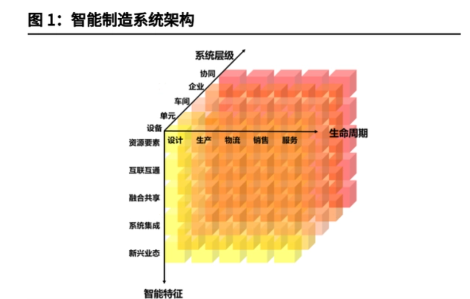 廣闊的發(fā)展前景,曲折的前進(jìn)道路。根據(jù)《智能制造發(fā)展規(guī)劃(2016-2020 年)》,智能制造是基于新一代信息通信技術(shù)與先進(jìn)制造技術(shù)深度融合,貫穿于設(shè)計(jì)、生產(chǎn)、管理、服務(wù)等制造活動(dòng)的各個(gè)環(huán)節(jié),具有自感知、自學(xué)習(xí)、自決策、自執(zhí)行、自適應(yīng)等功能的新型生產(chǎn)方式。然而,上述內(nèi)容只描述了智能 制造廣闊的發(fā)展空間和其所引領(lǐng)的深刻變革,在智能制造的實(shí)際落地過程中, 仍需分步驟分階段,解決諸多共性和特性問題。具體來看,智能制造由自動(dòng)化、數(shù)字化、網(wǎng)絡(luò)化和智能化四大要素組成。自動(dòng)化是實(shí)現(xiàn)流程標(biāo)準(zhǔn)化、信息可采集的技術(shù)基礎(chǔ);數(shù)字化是充分利用數(shù)據(jù)要素, 實(shí)現(xiàn)企業(yè)全流程再造的必經(jīng)之路;網(wǎng)絡(luò)化是推動(dòng)端到端全場(chǎng)景互聯(lián),重塑價(jià)值鏈環(huán)節(jié)的連接紐帶;智能化是轉(zhuǎn)向智能決策支持,賦能產(chǎn)業(yè)革命的最終目標(biāo)。在智能制造由愿景變?yōu)楝F(xiàn)實(shí)的過程中,上述要素的演進(jìn)并沒有絕對(duì)的先后順序,而是需要相輔相成、螺旋前進(jìn)。其中,為實(shí)現(xiàn)自動(dòng)化所需的軟硬件升級(jí), 是相對(duì)容易滿足的必要條件,而為完成數(shù)字化轉(zhuǎn)型所必須實(shí)現(xiàn)的企業(yè)再造,是當(dāng)前難點(diǎn)和成敗關(guān)鍵。