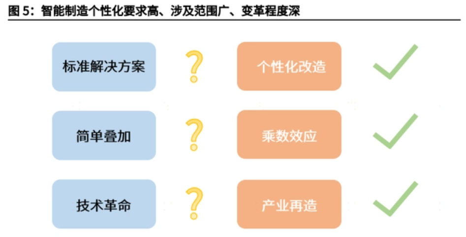 是企業(yè)再造,而不只是技術(shù)革命。智能制造的發(fā)展重點(diǎn),不在于各環(huán)節(jié)的新技術(shù)引進(jìn),而在于企業(yè)能否抓住時(shí)代機(jī)遇,實(shí)現(xiàn)自我重塑。技術(shù)對(duì)于企業(yè)的賦能效果如何,最終取決于企業(yè)戰(zhàn)略、管理架構(gòu)和業(yè)務(wù)流程能否提供有力支撐和廣闊舞臺(tái)。因此,智能制造的本質(zhì)不只是技術(shù)革命,資金投入可以直接提升軟硬件的技術(shù)水平,但不能直接提升企業(yè)創(chuàng)造新價(jià)值的能力。企業(yè)對(duì)自身的認(rèn)知和變革,才是智能制造實(shí)際成效的決定性因素??偨Y(jié)來看,智能制造個(gè)性化要求高、涉及范圍廣、變革程度深,不僅需要企業(yè)在發(fā)展戰(zhàn)略和業(yè)務(wù)流程上不斷推動(dòng)變革,也需要政策進(jìn)行合理引導(dǎo)和有力扶持。智能制造將重塑過去數(shù)十年全球產(chǎn)業(yè)分工的微笑曲線,生產(chǎn)環(huán)節(jié)將不再是 可替代、可轉(zhuǎn)移的低端環(huán)節(jié),而是將成為企業(yè)產(chǎn)品力、產(chǎn)業(yè)競(jìng)爭(zhēng)力的重要組成部分,成為高質(zhì)量發(fā)展的必由之路。在此過程中,需要政府與企業(yè)同心戮力, 在核心技術(shù)攻關(guān)、應(yīng)用經(jīng)驗(yàn)推廣、產(chǎn)業(yè)生態(tài)建設(shè)等方面開創(chuàng)新模式,建立新機(jī)制。