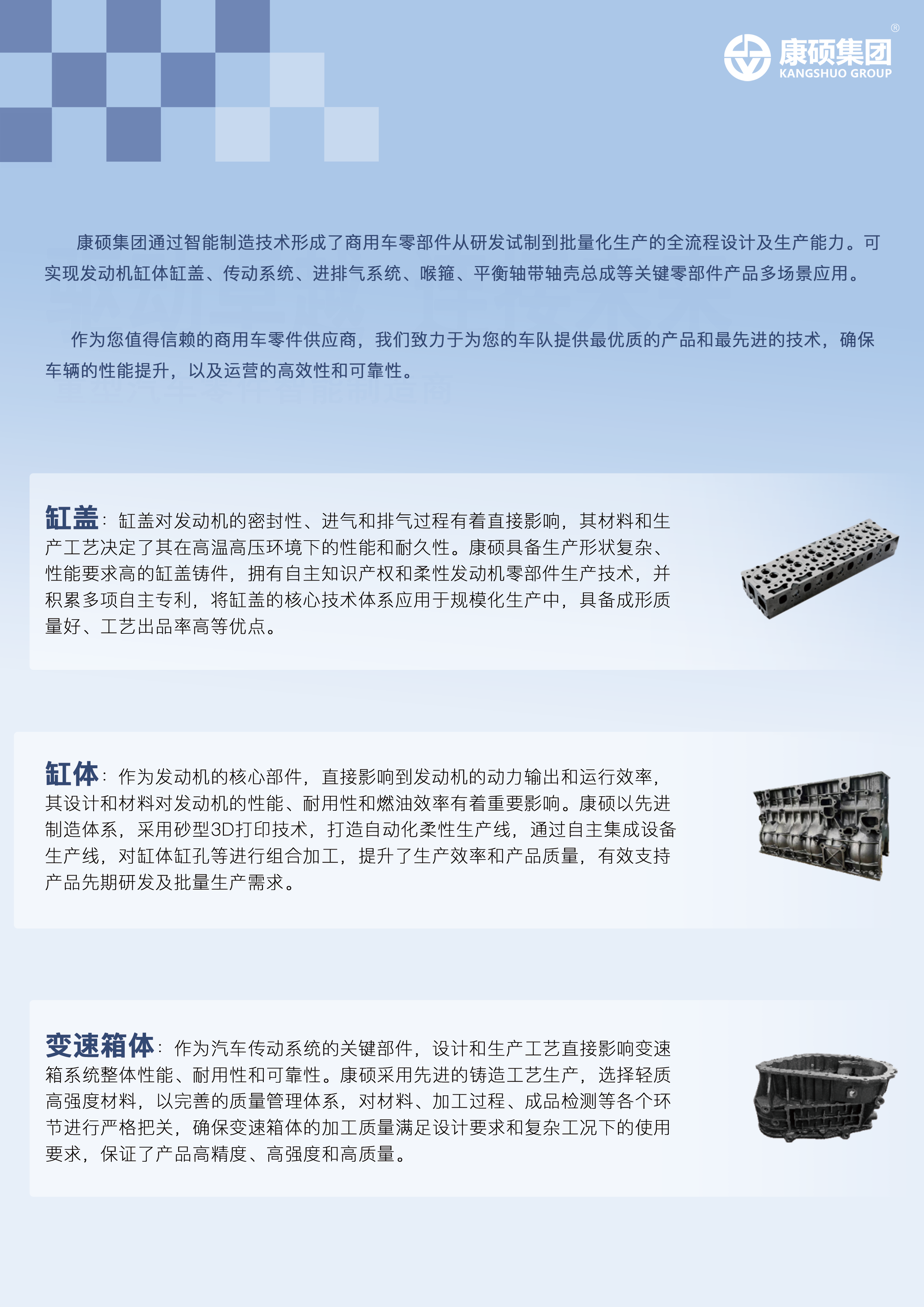 通過不斷的技術(shù)創(chuàng)新和智能制造的深入應用,康碩集團為商用車發(fā)動機部件制造領域提供了全面的數(shù)字化制造生產(chǎn)解決方案。這些技術(shù)的應用不僅提高了產(chǎn)品的質(zhì)量和性能,還推動了商用車行業(yè)向更高效、更可靠、更環(huán)保的未來發(fā)展。
