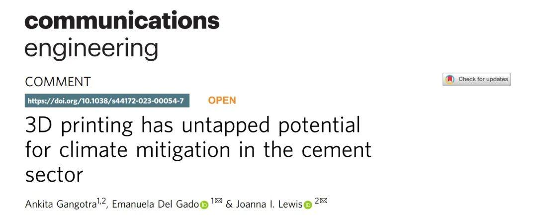 在過去的幾十年里,全球人口一直在穩(wěn)步增長,這意味著房屋等建筑數(shù)量也在隨之攀升。住宿建設(shè)必不可少的是水泥產(chǎn)品(包括水泥和混凝土),這是當(dāng)今使用最廣泛的資源之一。根據(jù)聯(lián)合國經(jīng)濟(jì)和社會事務(wù)部(人口司)進(jìn)行的預(yù)測未來幾年世界人口的研究報告顯示:到2060 年,這個星球上的人口預(yù)計將超過100億。考慮到目前約占二氧化碳排放總量8%的水泥生產(chǎn),建筑行業(yè)的排放量可能會進(jìn)一步增加。因此,由 Ankita Gangotra、Emanuela Del Gado 和 Joanna I. Lewis 組成的研究團(tuán)隊一直在研究使用水泥和相關(guān)材料進(jìn)行3D打印的可能性,他們都在美利堅合眾國喬治城大學(xué)工作氣候保護(hù)。關(guān)于這個令人興奮的建筑行業(yè)水泥3D打印項(xiàng)目,您可以在發(fā)表在《Commun Eng》期刊上的題為“3D printing has untapped potential for climate mitigation in thecement sector”研究論文中找到進(jìn)一步信息。