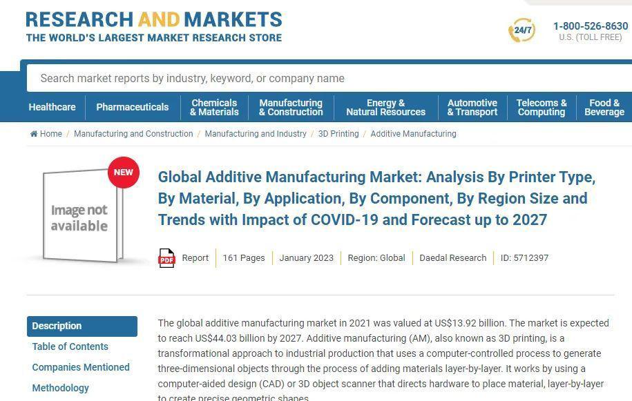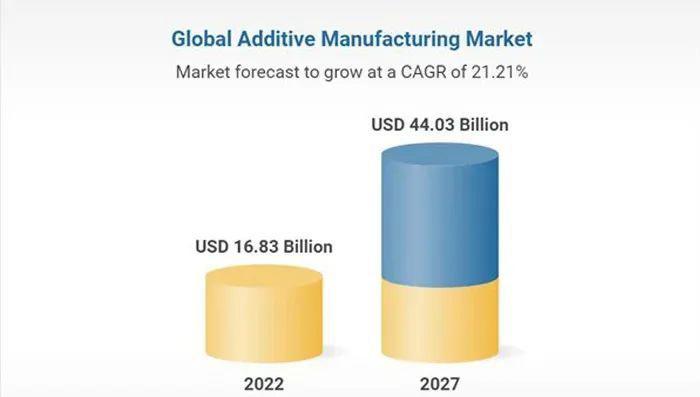Research and Markets于2023年初發(fā)布了一份關(guān)于全球3D打印市場(chǎng)的最新研究報(bào)告。該公司估計(jì),到2027年,3D打印行業(yè)的價(jià)值將從今年的168.3億美元(約1137億人民幣)增長到440.3億美元(約2975億人民幣),即2021年至2027年的年增長率為21%。